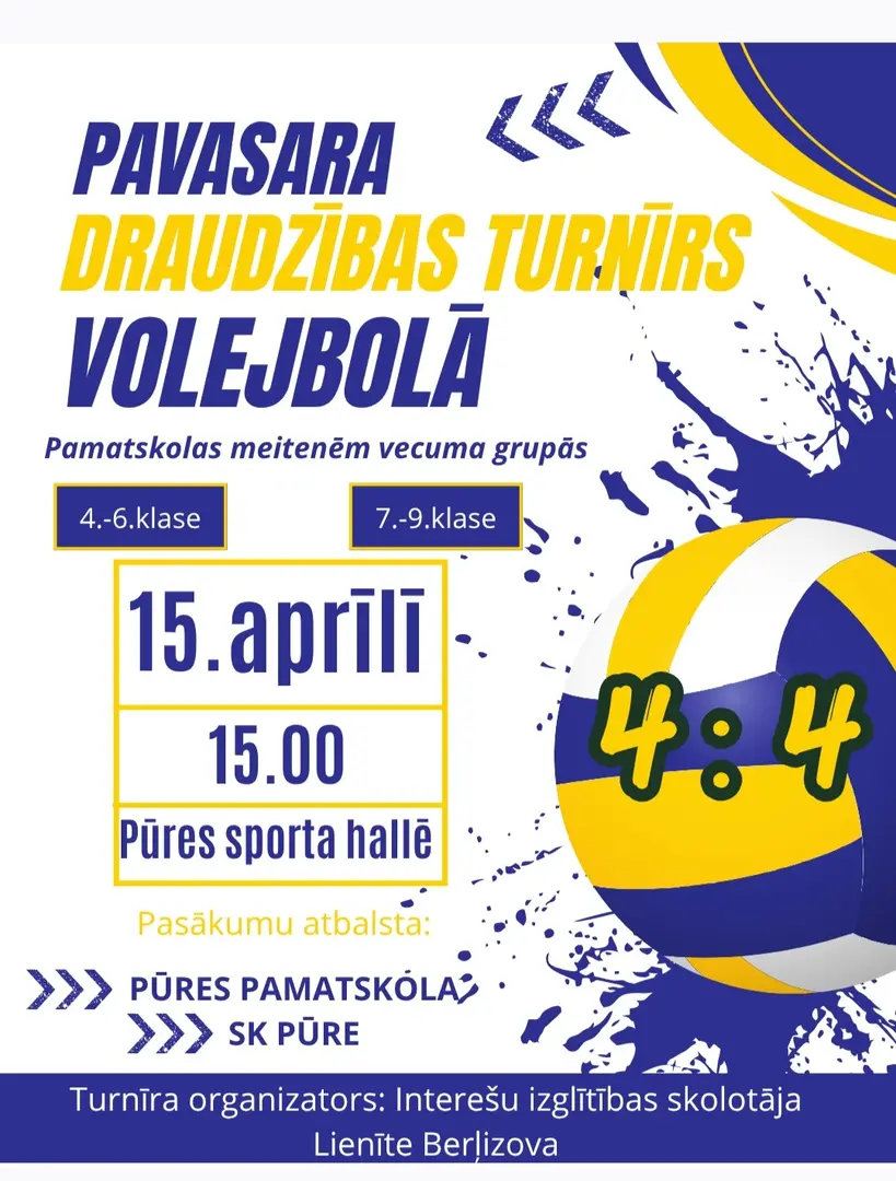 15. aprīļa pēcpusdienā Pūres sporta hallē notika pavasara draudzības turnīrs volejbolā meitenēm. No mūsu skolas tajā piedalījās 2 komandas – 7.-9. klašu grupā, iegūstot 1. vietu, bet 4.-6. klašu grupā 2.vietu. Par vērtīgāko spēlētāju no mūsu skolas 4.-6. klašu grupā tika atzīta Elīza Beatrise Melbikse, bet 7.-9. klašu grupā Gabriela Laurinoviča. Apsveicam un lepojamies!